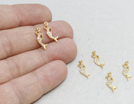 24 Carat Gold Plated White Zircon Stone Mermaid Charms Mermaid Pendant. Dimensions: 6x17mm Price is per piece. 24 carat gold plated on brass. A Quality product does not rust or tarnish. Do not contact with chemicals and perfumes for long-term use. Passed all tests does not contain harmful materials. Colors may vary depending on screen settings and ambient light.