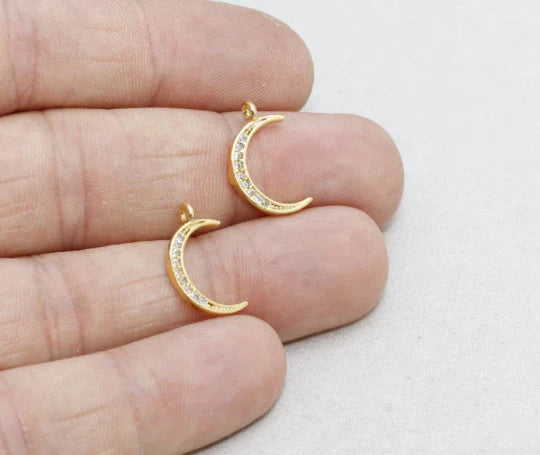 24K Gold Plated White Zircon Stone Moon Charms Moon Pendant. Dimensions: 10x16mm Price is per piece. 24K gold plated on brass. A Quality product does not rust or tarnish. Do not contact with chemicals and perfumes for long-term use. Passed all tests does not contain harmful materials. Colors may vary depending on screen settings and ambient light.