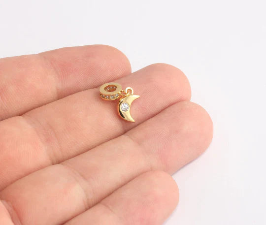 24K Gold Plated White Zircon Stone Moon Dangle Charms Moon Dangle Necklace Pendant. Dimensions: 2.5x7mm Price is per piece. 24K gold plated on brass. A Quality product does not rust or tarnish. Do not contact with chemicals and perfumes for long-term use. Passed all tests does not contain harmful materials. Colors may vary depending on screen settings and ambient light.