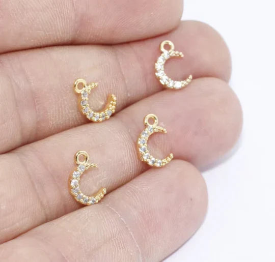 24K Gold Plated White Zircon Stone Shiny Moon Charms Moon Pendant. Dimensions: 7x10mm Price is per piece. 24K gold plated on brass. A Quality product does not rust or tarnish. Do not contact with chemicals and perfumes for long-term use. Passed all tests does not contain harmful materials. Colors may vary depending on screen settings and ambient light.