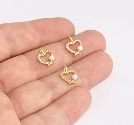 24K Gold Plated White Zircon Stone Shiny Pearl Heart Charms Pearl Heart Pendant. Dimensions: 10x13mm Price is per piece. 24K gold plated on brass. A Quality product does not rust or tarnish. Do not contact with chemicals and perfumes for long-term use. Passed all tests does not contain harmful materials. Colors may vary depending on screen settings and ambient light.