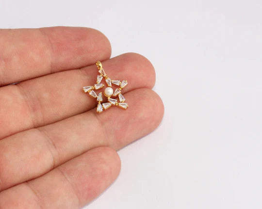 24K Gold Plated White Zircon Stone Pearl Star Charms Pearl Star Pendant. Dimensions: 18x21mm Price is per piece. 24K gold plated on brass. A Quality product resistant to rust and tarnishing. Do not contact with chemicals and perfumes for long-term use. Passed all tests does not contain harmful materials. Colors may vary depending on screen settings and ambient light.