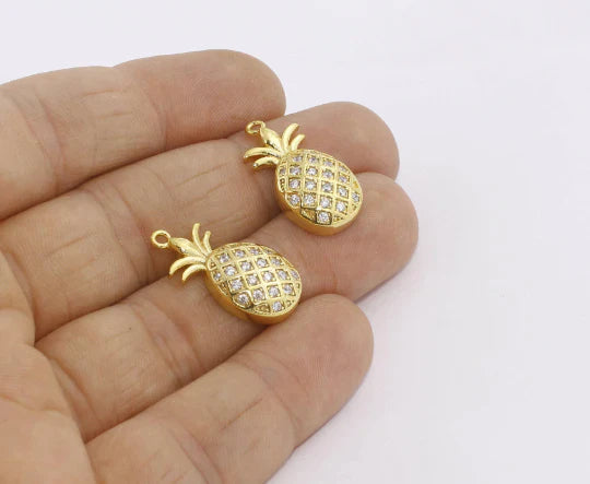 24 Carat Gold Plated White Zircon Stone Shiny Pineapple Charms Pineapple Pendant. Dimensions: 11x20mm Price is per piece. 24 carat gold plated on brass. A Quality product resistant to rust and tarnishing. Do not contact with chemicals and perfumes for long-term use. Passed all tests does not contain harmful materials. Colors may vary depending on screen settings and ambient light.