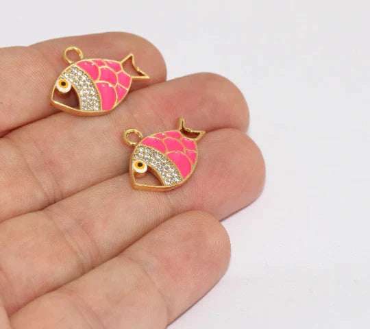24K Gold Plated White Zircon Stone Pink Enamel Shiny Fish Charms Fish Pendant. Dimensions: 16x22mm Price is per piece. 24K gold plated on brass. A Quality product resistant to rust and tarnishing. Do not contact with chemicals and perfumes for long-term use. Passed all tests does not contain harmful materials. Colors may vary depending on screen settings and ambient light.