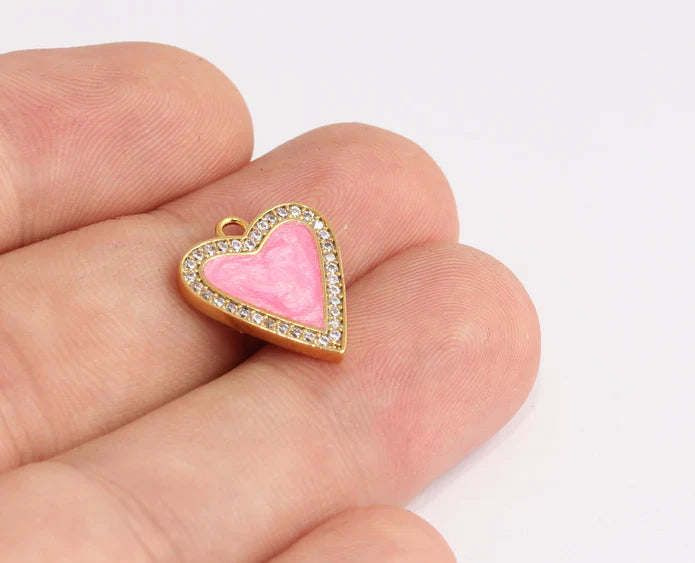 24K Gold Plated White Zircon Stone Pink Heart Charms Heart Pendant. Dimensions: 15x18mm Price is per piece. 24K gold plated on brass. A Quality product resistant to rust and tarnishing. Do not contact with chemicals and perfumes for long-term use. Passed all tests does not contain harmful materials. Colors may vary depending on screen settings and ambient light.