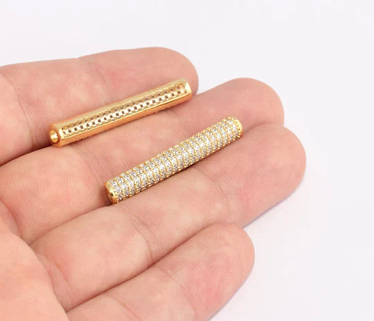 24 Carat Gold Plated White Zircon Stone Shiny Pipe Charms Pipe Pendant. Dimensions: 6x37mm Price is per piece. 24 carat gold plated on brass. A Quality product resistant to rust and tarnishing. Do not contact with chemicals and perfumes for long-term use. Passed all tests does not contain harmful materials. Colors may vary depending on screen settings and ambient light.