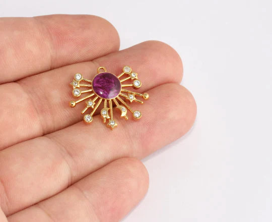24K Gold Plated White Zircon Stone Purple Enamel Galaxy Charms Galaxy Pendant. Dimensions: 22x26mm Price is per piece. 24K gold plated on brass. A Quality product resistant to rust and tarnishing. Do not contact with chemicals and perfumes for long-term use. Passed all tests does not contain harmful materials. Colors may vary depending on screen settings and ambient light.