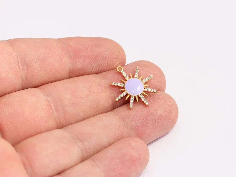 24K Gold Plated White Zircon Stone Purple Enamel Shiny Sun Charms Sun Pendant. Dimensions: 19x21mm Price is per piece. 24K gold plated on brass. A Quality product resistant to rust and tarnishing. Do not contact with chemicals and perfumes for long-term use. Passed all tests does not contain harmful materials. Colors may vary depending on screen settings and ambient light.