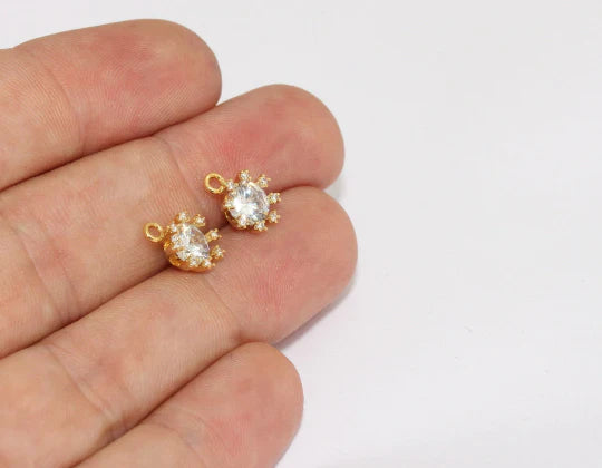 24 Carat Gold Plated White Zircon Stone Shiny Round Charms Round Pendant. Dimensions: 6 mm Price is per piece. 24 carat gold plated on brass. A Quality product does not rust or tarnish. Do not contact with chemicals and perfumes for long-term use. Passed all tests does not contain harmful materials. Colors may vary depending on screen settings and ambient light.