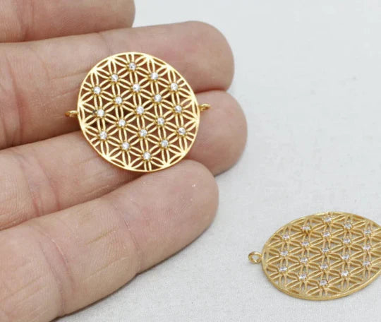 24K Gold Plated White Zircon Stone Shiny Round Charms Round Pendant. Dimensions: 25mm Price is per piece. 24K gold plated on brass. A Quality product resistant to rust and tarnishing. Do not contact with chemicals and perfumes for long-term use. Passed all tests does not contain harmful materials. Colors may vary depending on screen settings and ambient light.