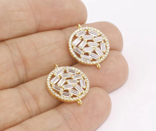 24 Carat Gold Plated White Zircon Stone Shiny Round Charms Round Pendant. Dimensions: 18x21mm Price is per piece. 24 carat gold plated on brass. A Quality product resistant to rust and tarnishing. Do not contact with chemicals and perfumes for long-term use. Passed all tests does not contain harmful materials. Colors may vary depending on screen settings and ambient light.