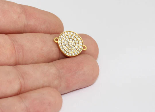 24 Carat Gold Plated White Zircon Stone Shiny Round Charms Round Pendant. Dimensions: 14x20mm Price is per piece. 24 carat gold plated on brass. A Quality product resistant to rust and tarnishing. Do not contact with chemicals and perfumes for long-term use. Passed all tests does not contain harmful materials. Colors may vary depending on screen settings and ambient light.