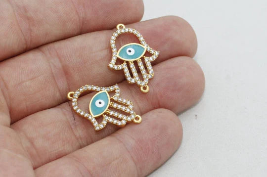 24 carat gold plated white zircon stone shiny blue evil eye Fatima hand charms evil eye Fatima hand pendant. Dimensions: 18x24mm Price is per piece. 24 carat gold plated on brass. A quality product resistant to rust and tarnishing. Do not contact with chemicals and perfumes for long-term use. Passed all tests does not contain harmful materials. Colors may vary depending on screen settings and ambient light.