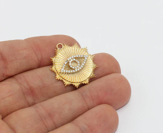 24K Gold Plated White Zircon Stone Shiny Sun-Eye Charms Sun-Eye Pendant. Dimensions: 25mm Price is per piece. 24K gold plated on brass. A Quality product resistant to rust and tarnishing. Do not contact with chemicals and perfumes for long-term use. Passed all tests does not contain harmful materials. Colors may vary depending on screen settings and ambient light.