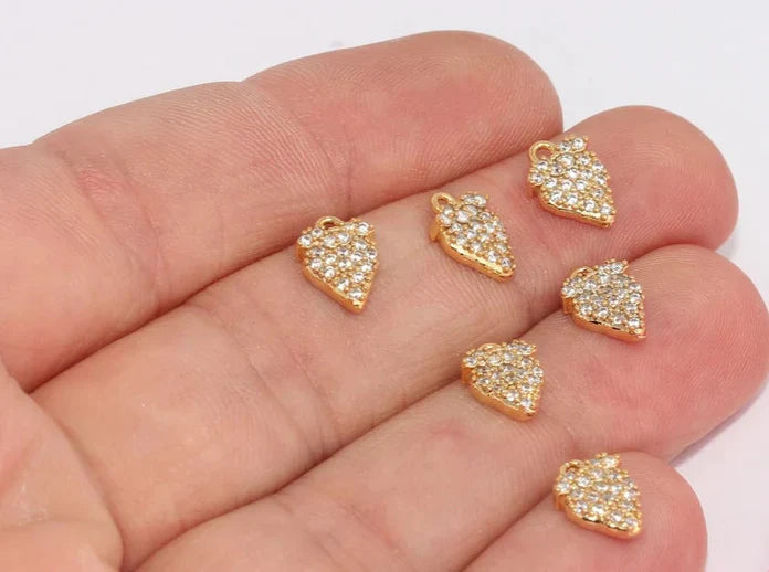 24 Carat Gold Plated White Zircon Stone Shiny Strawberry Charms Strawberry Pendant. Dimensions: 7x10mm Price is per piece. 24 carat gold plated on brass. A Quality product does not rust or tarnish. Do not contact with chemicals and perfumes for long-term use. Passed all tests does not contain harmful materials. Colors may vary depending on screen settings and ambient light.
