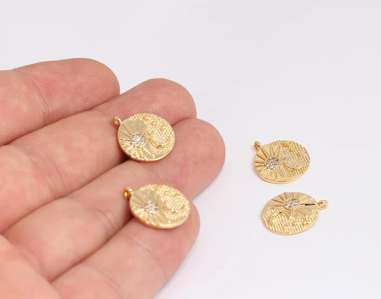 24K Gold Plated White Zircon Stone Shiny Sun and Moon Charms Sun and Moon Pendant. Dimensions: 15x17mm Price is per piece. 24K gold plated on brass. A Quality product resistant to rust and tarnishing. Do not contact with chemicals and perfumes for long-term use. Passed all tests does not contain harmful materials. Colors may vary depending on screen settings and ambient light.