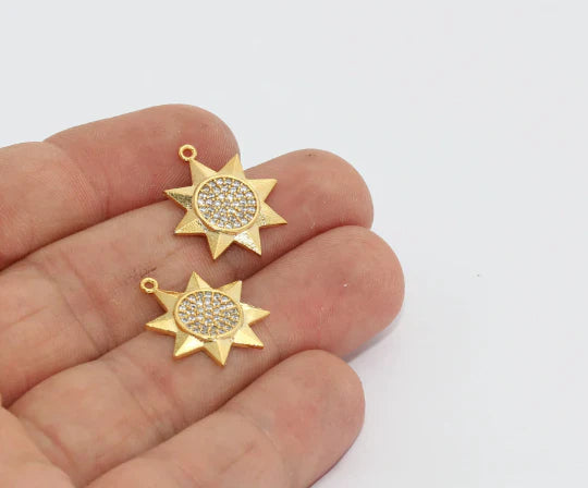 24K Gold Plated White Zircon Stone Shiny Sun Charms Sun Pendant. Dimensions: 18x20mm Price is per piece. 24K gold plated on brass. A Quality product resistant to rust and tarnishing. Do not contact with chemicals and perfumes for long-term use. Passed all tests does not contain harmful materials. Colors may vary depending on screen settings and ambient light.