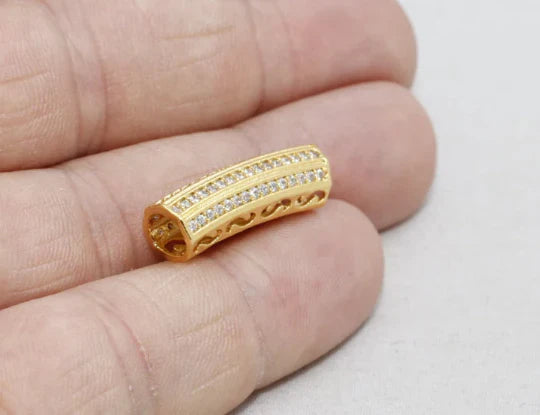 24K Gold Plated White Zircon Stone Shiny Tube Charms Tube Pendant. Dimensions: 7x22mm Price is per piece. 24K gold plated on brass. A Quality product resistant to rust and tarnishing. Do not contact with chemicals and perfumes for long-term use. Passed all tests does not contain harmful materials. Colors may vary depending on screen settings and ambient light.
