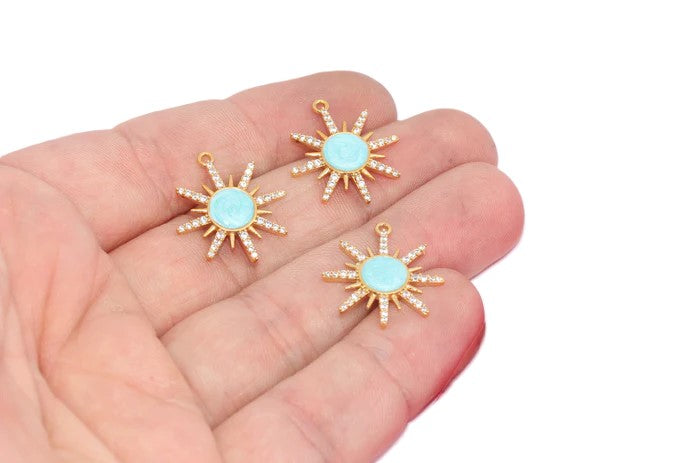 24K Gold Plated White Zircon Stone Turquoise Enamel Shiny Sun Charms Sun Pendant. Dimensions: 19x21mm Price is per piece. 24K gold plated on brass. A Quality product resistant to rust and tarnishing. Do not contact with chemicals and perfumes for long-term use. Passed all tests does not contain harmful materials. Colors may vary depending on screen settings and ambient light.