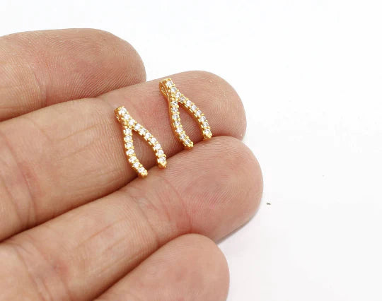 24 Carat Gold Plated White Zircon Stone Shiny Wishbone Charms Wishbone Pendant. Dimensions: 6x13mm Price is per piece. 24 carat gold plated on brass. A Quality product does not rust or tarnish. Do not contact with chemicals and perfumes for long-term use. Passed all tests does not contain harmful materials. Colors may vary depending on screen settings and ambient light.