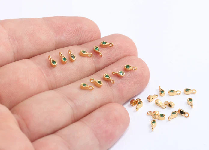 24 Carat Gold Plated Zircon Stone Shiny Green Drop Pendant Drop Charms. Dimensions: 2.5x6mm Price is per piece. 24 carat gold plated on brass. A Quality product does not rust or tarnish. Do not contact with chemicals and perfumes for long-term use. Passed all tests does not contain harmful materials. Colors may vary depending on screen settings and ambient light.