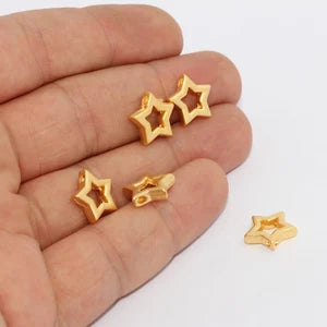 Matte Gold Plated Thick Star Necklace Pendant Spacer Bracelet and Necklace Pendant Dimensions: 12x14mm. Package price. There are 5 products in 1 package. 24 carat gold plated on brass. A Quality product resistant to rust and tarnishing. Do not contact with chemicals and perfumes for long-term use. It has passed all tests and does not contain harmful materials. Colors may vary depending on screen settings and ambient light.