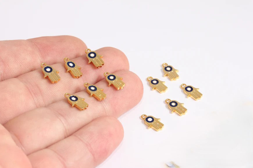 Shiny Gold Plated Hamsa Pendant Fatima's Hand Pendant Evil Eye Beaded Enameled Dangling Pendant Dimensions: 8x12mm. Package price. There are 5 products in 1 package. 24 carat gold plated on brass. A quality product resistant to rust and tarnishing. Do not contact with chemicals and perfumes for long-term use. It has passed all tests does not contain materials harmful to health. Colors may vary depending on screen settings and ambient light.