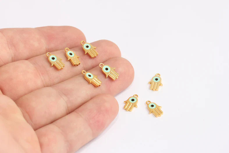 Shiny Gold Plated Hamsa Pendant Fatima's Hand Pendant Turquoise Enameled Dangling Pendant Bracelet Bangle Pendant Dimensions: 8x12mm Enamel Color Options: White Pink Price is per piece. 24 carat gold plated on brass. A quality product resistant to rust and tarnishing. Do not contact with chemicals and perfume for long-term use. It has passed all tests does not contain materials harmful to health. Colors may vary depending on screen settings and ambient light.