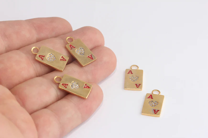 24k Shiny Gold Playing Card Ace of Hearts Pendant. Dimensions: 11x21mm Price is per piece. 24 carat gold plated on brass. A Quality product resistant to rust and tarnishing. Do not contact with chemicals and perfumes for long-term use. Passed all tests does not contain harmful materials. Colors may vary depending on screen settings and ambient light.