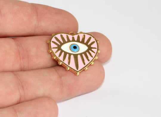 24 Carat Shiny Gold Plated Pink Enamel Eyelash Evil Eye Heart Pendant Dangling Heart Charm Dimensions: 27x28 mm Price is for one piece. 24 carat gold plated on brass. A Quality product resistant to rust and tarnishing. Do not contact with chemicals and perfumes for long-term use. Passed all tests does not contain harmful materials. Colors may vary depending on screen settings and ambient light.