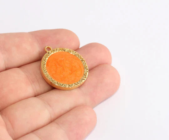 24K Shiny Gold Plated Orange Round Pendant Sun Charm. Dimensions: 28x30mm Price is per piece. 24K gold plated on brass. A Quality product resistant to rust and tarnishing. For long-term use do not contact with chemicals and perfumes. Passed all tests does not contain harmful materials. Colors may vary depending on screen settings and ambient light.