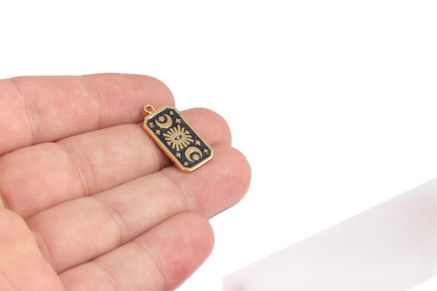 24 carat bright gold plated black enamel sun crescent and stars evil eye medallion pendant. Dimensions: 12x25mm Price is per piece. 24 carat gold plated on brass. A quality product resistant to rust and tarnishing. Do not contact with chemicals and perfumes for long-term use. Passed all tests does not contain harmful materials. Colors may vary depending on screen settings and ambient light.