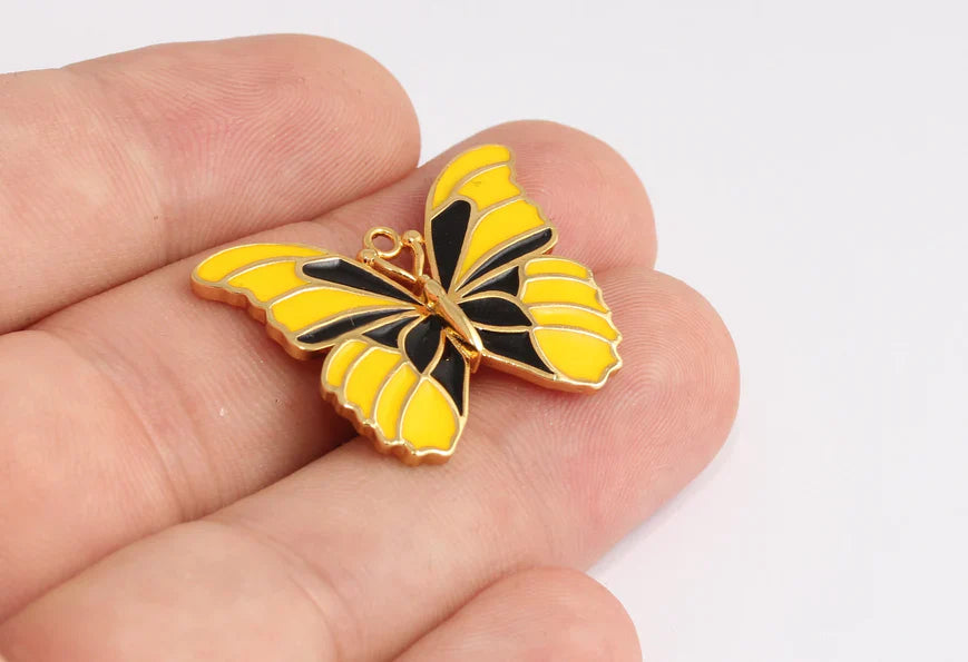 24 Carat Shiny Gold Plated Butterfly Charms Yellow Enameled Butterfly. Dimensions: 25x31mm Price is per piece. 24 carat gold plated on brass. A Quality product resistant to rust and tarnishing. Do not contact with chemicals and perfumes for long-term use. Passed all tests does not contain harmful materials. Colors may vary depending on screen settings and ambient light.