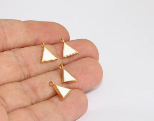 Shiny Gold Plated White Color Enameled Triangle Pendant Dimensions: 9x11mm Price is per piece. 24 carat gold plated on brass. A Quality product resistant to rust and tarnishing. Do not contact with chemicals and perfumes for long-term use. It has passed all tests and does not contain harmful materials. Colors may vary depending on screen settings and ambient light.