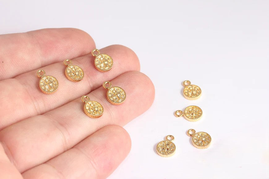 Shiny Gold Plated Cross Mini Cross Round Pendant Dimensions: 8x11mm. Package price. There are 5 products in 1 package. 24 carat gold plated on brass. A Quality product resistant to rust and tarnishing. Do not contact with chemicals and perfumes for long-term use. It has passed all tests and does not contain harmful materials. Colors may vary depending on screen settings and ambient light.