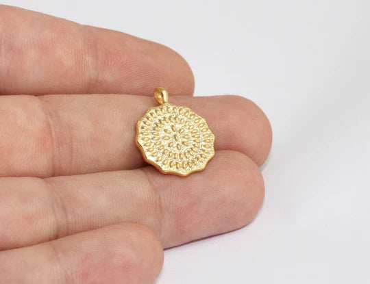 24K Shiny Gold Plated Pendant with Embossed Flower in the Middle Medallion. Dimensions: 19mm Price is per piece. 24K gold plated on brass. A Quality product resistant to rust and tarnishing. Do not contact with chemicals and perfumes for long-term use. Passed all tests does not contain harmful materials. Colors may vary depending on screen settings and ambient light.