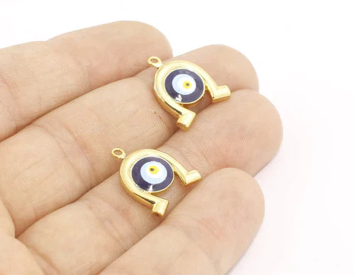 24K Shiny Gold Plated Evil Eye Bead Horseshoe Pendant Horseshoe Shaped Charm. Dimensions: 15x18mm. Package price. There are 3 products in 1 package. Brass is 24K gold plated. A Quality product resistant to rust and tarnishing. Do not contact with chemicals and perfumes for long-term use. Passed all tests does not contain harmful materials. Colors may vary depending on screen settings and ambient light.