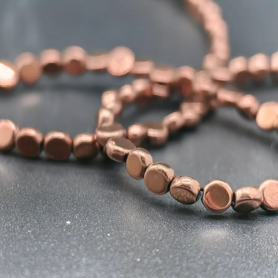 4 mm Copper Color Round Hematite Natural Stone.Dimensions: 2 mm x 4 mm.Sold in strands.Each strand contains approximately 111 hematite stones.It is a natural hematite stone.Hematite is a shiny natural stone with a metallic appearance, believed to affect the root chakra.It is thought to provide energy, courage, and joy to the user while relieving stress.Hematite stones can be used in the design of bracelets, necklaces, and earrings.
