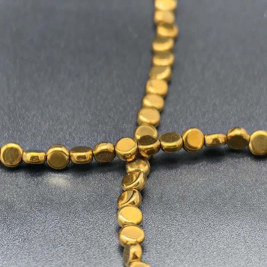 4 mm Gold Yellow Round Hematite Natural Stone.Dimensions: 2 mm x 4 mm.Sold in strands.Each strand contains approximately 111 hematite stones.It is a natural hematite stone.Hematite is a shiny natural stone with a metallic appearance, believed to affect the root chakra.It is thought to provide energy, courage, and joy to the user while relieving stress.Hematite stones can be used in the design of bracelets, necklaces, and earrings.