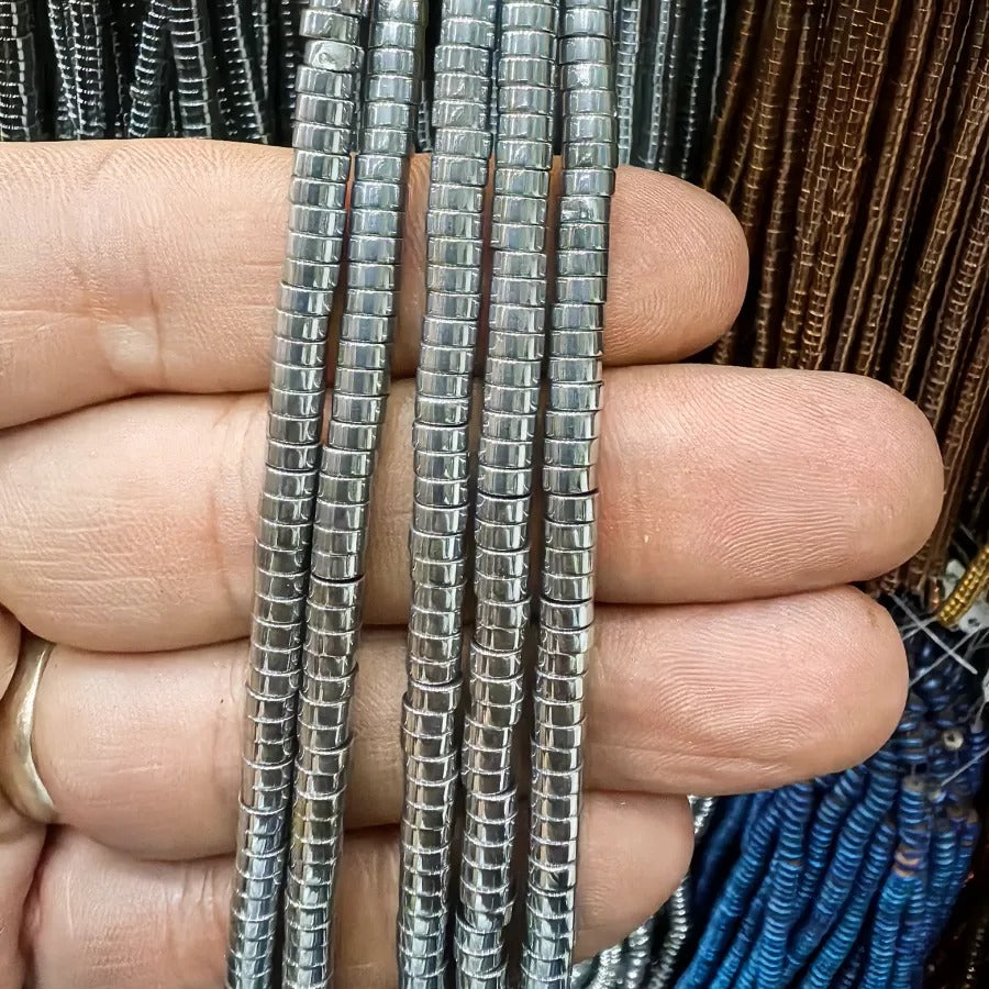 4 mm Silver Color Thick Disc Cut Rondelle Hematite Natural Stone.Dimensions: 2 mm x 4 mm.Sold in strands.Each strand contains approximately 160 hematite stones.It is a natural hematite stone.Hematite is a shiny natural stone with a metallic appearance, believed to affect the root chakra.It is thought to provide energy, courage, and joy to the user while relieving stress.Hematite stones can be used in the design of bracelets, necklaces, and earrings.