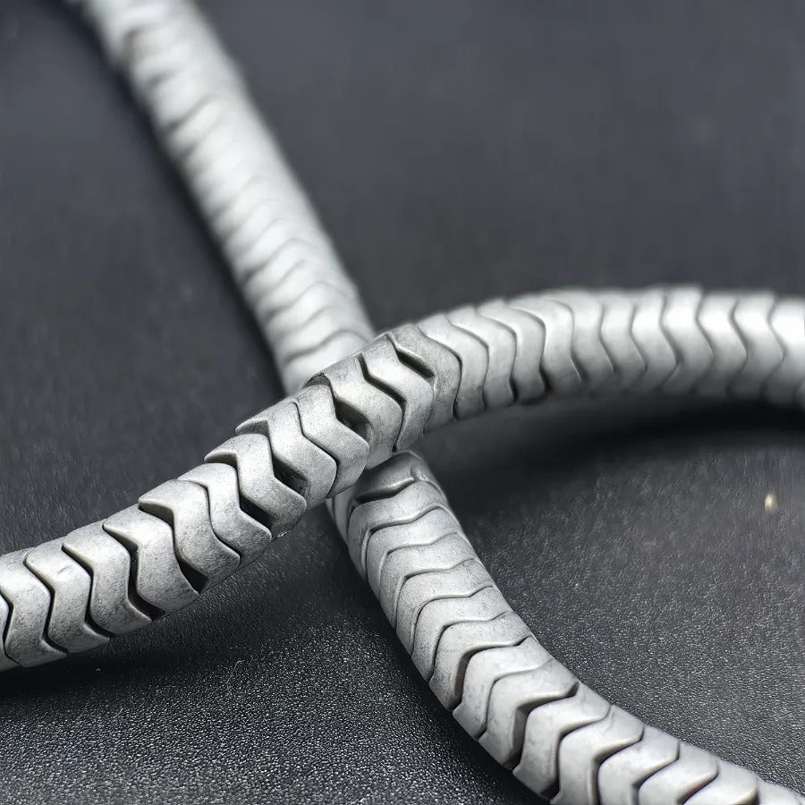6 mm Matte Silver Color Wavy Disc Hematite Natural Stone.Dimensions: 2 mm x 6 mm.Sold in strands.Each strand contains approximately 95 hematite stones.It is a natural hematite stone.Hematite is a shiny natural stone with a metallic appearance, believed to affect the root chakra.It is thought to provide energy, courage, and joy to the user while relieving stress.Hematite stones can be used in the design of bracelets, necklaces, and earrings.
