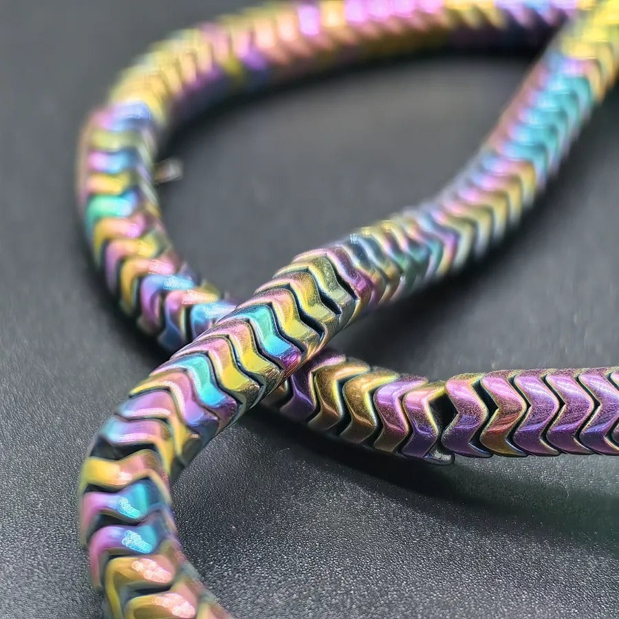 6 mm Multicolored Wavy Disc Hematite Natural Stone.Dimensions: 2 mm x 6 mm.Sold in strands.Each strand contains approximately 95 hematite stones.It is a natural hematite stone.Hematite is a shiny natural stone with a metallic appearance, believed to affect the root chakra.It is thought to provide energy, courage, and joy to the user while relieving stress.Hematite stones can be used in the design of bracelets, necklaces, and earrings.