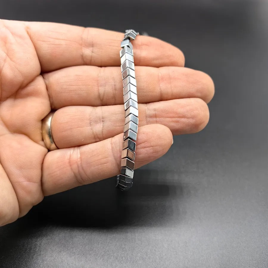 6 mm Silver Color Fishbone Hematite Natural Stone.Dimensions: 6 mm x 2 mm.Sold in strands.Each strand contains approximately 97 hematite stones.It is a natural hematite stone.Hematite is a shiny natural stone with a metallic appearance, believed to affect the root chakra.It is thought to provide energy, courage, and joy to the user while relieving stress.Hematite stones can be used in the design of bracelets, necklaces, and earrings.