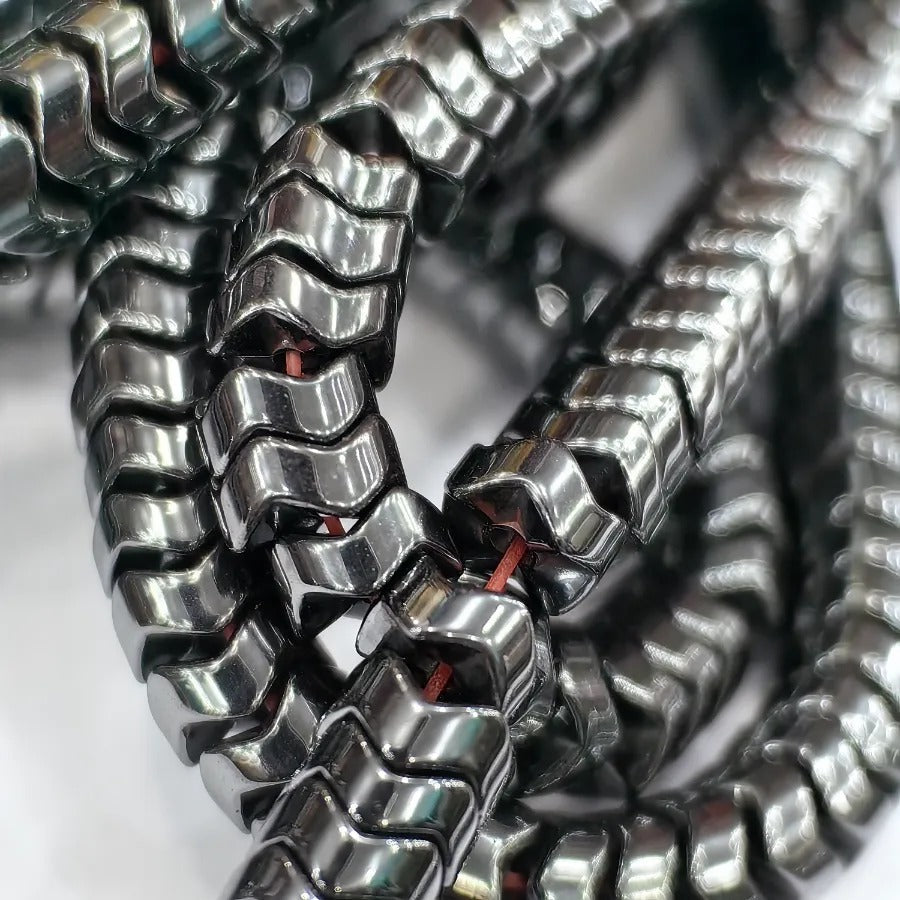 6 mm Gunmetal Snake Cut Hematite Natural Stone.Dimensions: 2 mm x 6 mm.Sold in strands.Each strand contains approximately 135 hematite stones.It is a natural hematite stone.Hematite is a shiny natural stone with a metallic appearance, believed to affect the root chakra.It is thought to provide energy, courage, and joy to the user while relieving stress.Hematite stones can be used in the design of bracelets, necklaces, and earrings.