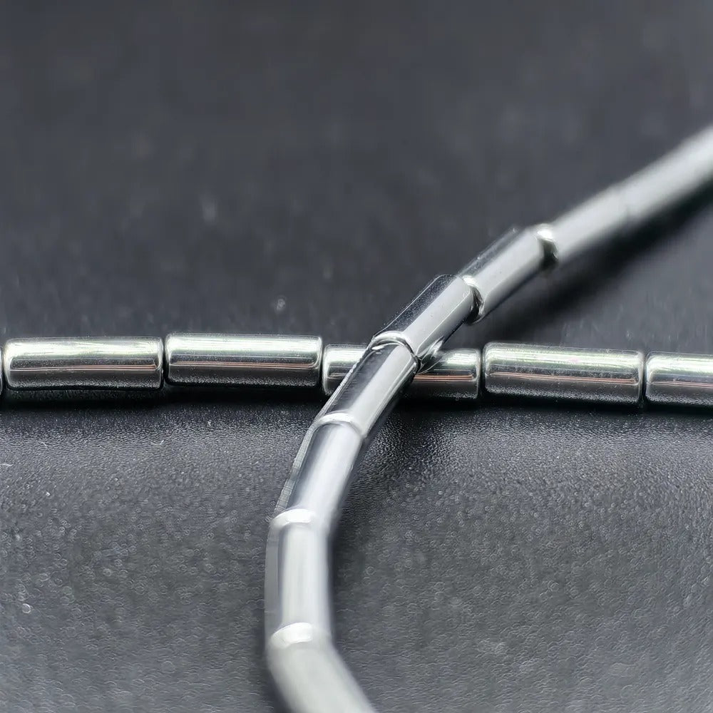 8 mm Gunmetal Cylinder Cut Hematite Natural Stone.Dimensions: 3 mm x 8 mm.Sold in strands.Each strand contains approximately 44 hematite stones.It is a natural hematite stone.Hematite is a shiny natural stone with a metallic appearance, believed to affect the root chakra.It is thought to provide energy, courage, and joy to the user while relieving stress.Hematite stones can be used in the design of bracelets, necklaces, and earrings.