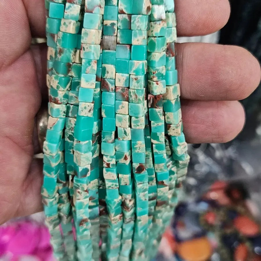 4 MM Cube Cut Green Variscite Natural Stone Strand. Price per strand. Approximately 85 stones per strand. Natural stones may contain different patterns veins and colors depending on their source. Small color differences may occur due to light and camera settings.