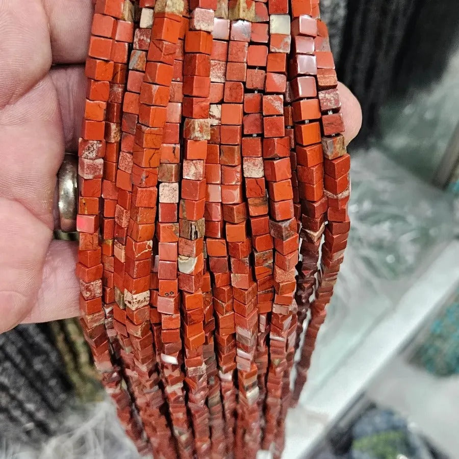 4 MM Cube Cut Orange Variscite Natural Stone Strand. Price per strand. Approximately 85 stones per strand. Natural stones may contain different patterns veins and colors depending on their source. Small color differences may occur due to light and camera settings.