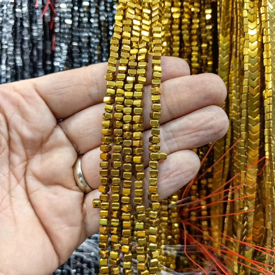 4 mm Gold Beveled Cube Hematite Natural Stone.Dimensions: 4 mm x 4 mm.Sold in strands.Each strand contains approximately 95 hematite stones.It is a natural hematite stone.Hematite is a shiny natural stone with a metallic appearance, believed to affect the root chakra.It is thought to provide energy, courage, and joy to the user while relieving stress.Hematite stones can be used in the design of bracelets, necklaces, and earrings.