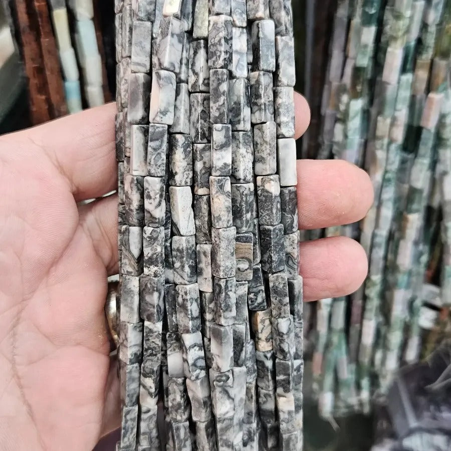 4 MM Rectangular Cut Grey Jasper Natural Stone Strand. Strand price. Each strand contains approximately 28 stones. Natural stones may contain different patterns veins and colors depending on their source. Due to light and camera settings there may be slight differences in colors.