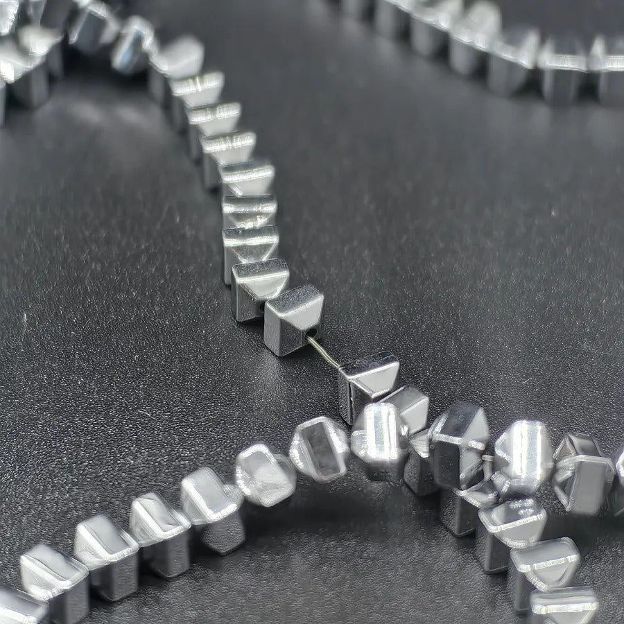 4 mm Silver Beveled Cube Cut Hematite Natural Stone.Dimensions: 3.8 mm x 4.50 mm.Sold in strands.Each strand contains approximately 108 hematite stones.It is a natural hematite stone.Hematite is a shiny natural stone with a metallic appearance, believed to affect the root chakra.It is thought to provide energy, courage, and joy to the user while relieving stress.Hematite stones can be used in the design of bracelets, necklaces, and earrings.